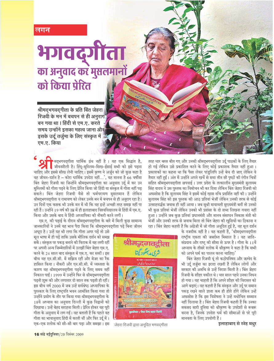 Zehera Rizvi a Muslim lady of 66 yrs and a Professor of Hindi from Allahabad came to the central attraction of Gita lovers and admirers as Smt. Rizvi completed such a great work after completion of her Masters in Sanskrit and Hindi to fulfill her dedication very successfully.