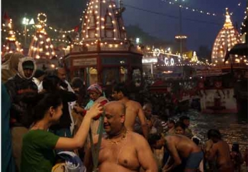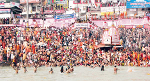 Indo-Asian News Service ||Haridwar, February 12, 2010|| Braving the dark of the pre-dawn hours, the chill in the air and the ice cold water of the Ganga, thousands of devotees ecstatically shouting “Bom Bom Bhole” started bathing in the holiest river of the Hindus on the occasion of Mahashivratri on Friday, one of the biggest days of the ongoing Maha Kumbh Mela in Haridwar.