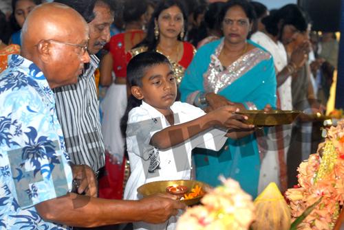 General secretary of the Shri Sanatan Dharm Brahman Purohit Maha Sabha, Kamal Sharma said their message to youths during Ram Naumi this year was to follow the teachings of Lord Rama in their life. Pic. Right >> Somal Raju, 9, performs prayers during the Ram Naumi celebration at the Samabula temple in Fiji yesterday.