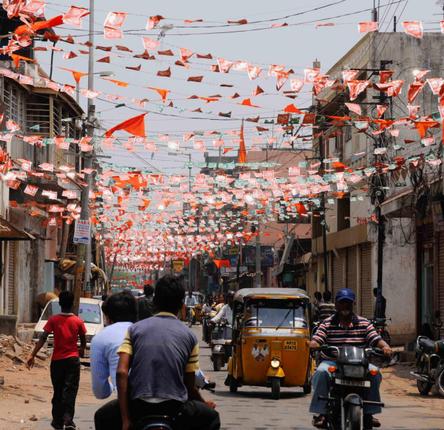 ^^A street in the old city area seen fully decorated with saffron flags for the Hanuman Jyanti festival. Riots subsequently broke out in the area. Photo: Mohammed Yousuf in The Hindu. The Green specs do not tolerate saffron items (HE).