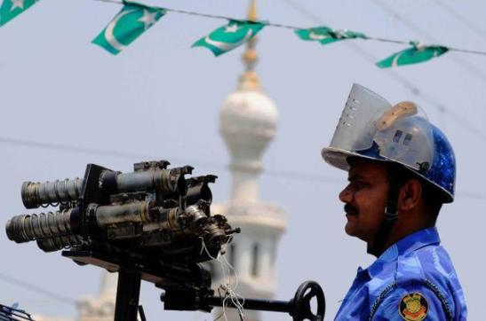 ^^An RAF constable stands by his tear-gas lobbing gun following clashes in Hyderabad’s old city. Photo: Mohammed Yousuf in The Hindu.
