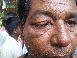 As per available report, 1) Sadek, (2) Masood, (3) Sabbir Goldar s/o, Alimuddin, (4) Kabir Goldar s/0, Alimuddin, (5) Bilal Mandal s/o, Jhuro Mandal, (6) Haider Ali Goldar s/o, Majnu Goldar, (7) Ratan Goldar s/o, Majnu,(8) Bishe Goldar s/o, Deedar, (9) Rabbari Mandal s/o, Haran, (10) Altaf Goldar s/o, Mamlabox, (11) Mafroj Goldar s/o, Mamlabox,(12) Moynak Mandal s/o, Mansur, (13) Alamat Bag s/o, Late Golam Bag, (14) Laltu Goldar, (15) Haider Ali Goldar, (16) Majnu Goldar, (17) Mainoor, (18) Ijjal, (19) Mobijul, (20) Firoj, (21) Rafik, (22) Raju and others were leading the Pic.^: Sunil Singhadar, right eye fatally damaged Muslim goons to hurt the Hindus, shouting the slogans : Narayee Takbeer, Allaha ho Akbar !! Some fire arms were also shown to the Hindus to terrorize the Hindus in the spot. Local Administration and Police were completely failure to keep and maintain the peace at the material point of the time of this “Mini Jihad” against the Hindus.
