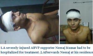 In this sudden and brutal attack amidst anti-national slogans and obscenities hurled at the patriotic members of the audience by the organizers among whom were some known notorious Maoists like Debolina Chakraborty, who was recently named by the West Bengal police as a collaborator in the Maoist atrocities in West Bengal, many ABVP and BJYM activists were grievously injured. Two of the activists Neeraj Kumar and Yagnik Agarwal were critically injured and had to be hospitalised while bleeding profusely with wounds on the head. One of them is still admitted to hospital in a critical condition. Others like Amitabha Roy, Tanushree Roy, Gautam Chaudhuri and others were also injured.