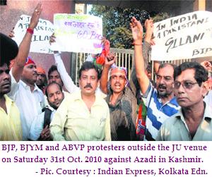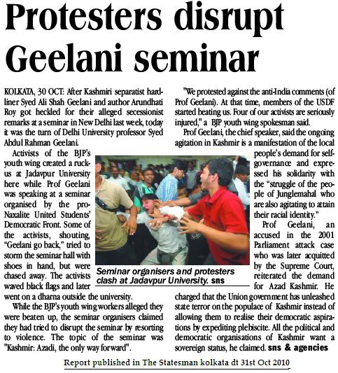 Post Script : The members of HYF (Hindu Youth Fornt), Kolkata were present in the place of occurrence so vitiated by Muslim-Maoist nexus in West Bengal. In the morning dailies published (30.11.2010) from Kolkata contained the news of Geelani coming to Kolkata and supporting the rights of notorious Arundhati Roy for Azad Kashmir by some Maoist-Psuedo Secularist Intellectuals of kolkata, irritated the patriotic mass here.
