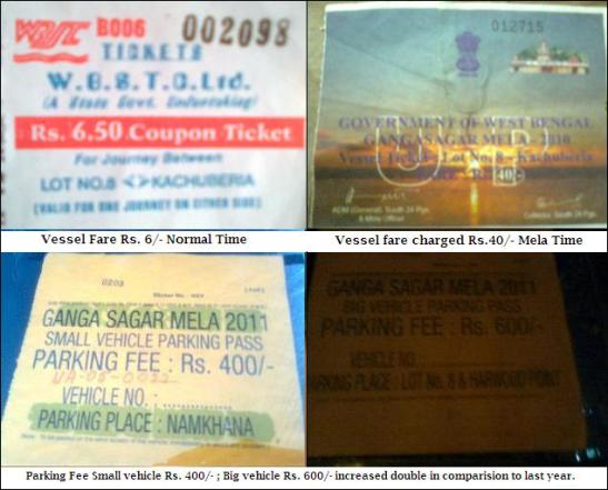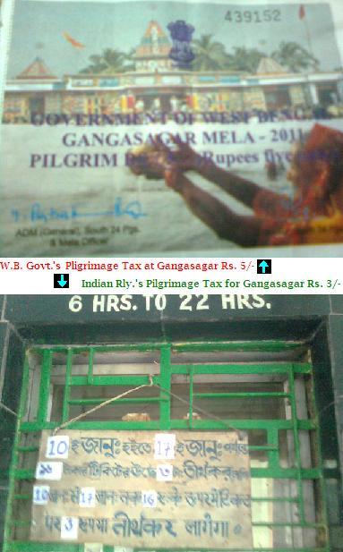 More over the State authority in WB is charging Rs 400/- for each small vehicle and Rs. 600/- for each big vehicle at two transit points at Harwood Point ( Lot-8) and Namkhana in the main land as parking fees apart from the pilgrimage tax. These fees are collected by the District Collectorate, South 24 Pgs. The South 24 Parganas District Zill Parisad (the District Civic Body) is now under the control of  Trinmool Congress of Ms. Mamta Banerjee (Central Railway minister), who is interested to display her countless hordings in a welcome mode picture throughout the NH 117 the Kolkata-Kakdwip-Namkhana roadways, but speechless about the such kind o loot from the Hindu pilgrims reaching Gangasagar.