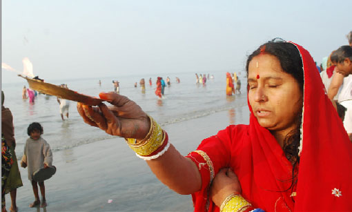 Aarti to Ganga & Suryargha – offerings to Mother Ganga and Sun God by a devotee in Gangasagar : An uncountable age long tradition of Hindus. (Pic. courtesy : Bartaman.)