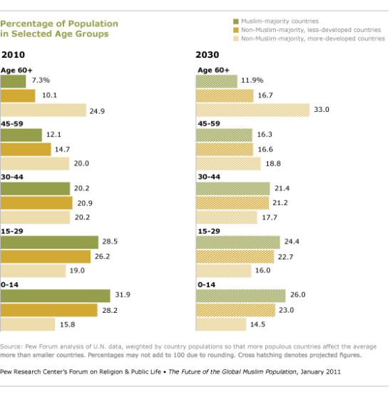 “In addition, a larger share of the Muslim population is in, or soon will enter, the prime reproductive years (ages 15-29). Also, improved health and economic conditions in Muslim-majority countries have led to greater-than-average declines in infant and child mortality rates, and life expectancy is rising even faster in Muslim-majority countries than in other less-developed countries,” the report said.