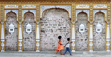 Image: Children play outside an old Hindu temple at Saidpur village on the outskirts of Islamabad. Some temples in Pakistan stand  as the symbols of last ruins of Hindus.