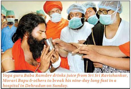 Spiritual leader Sri Sri Ravishankar, who met the 46-year-old yoga exponent for the third day at a Dehradun hospital, said, “Ramdev has broken his fast by taking juice. He ended the fast in the presence of various religious and spiritual leaders”.