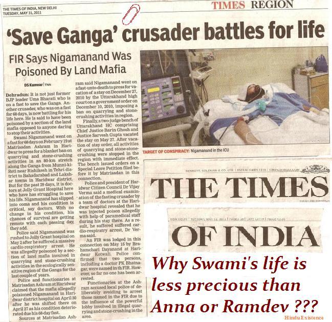yesterday the live india tv (www.liveindia.tv) hilariously blamed hindus for it and used it as a tool to blame baba ramdev. for instance ” ek sadhu 7 din anshan karke bangaye hero, dusra gumnam”, “ramdev ka anshan high profile tha aur nigamananda ka bina profile”,……blah blah blah………. i will be pleased to hear what the mediapersons were doing when he was fasting for 70 days ? now only when they got a chance to blame baba ramdev , all the hues and cries began ? its simply crap . how the bigoted media glorified anna hazare’s fast as he was free from religious mark, obviously , nigamanandaji started his fast far ago.. what the hell were they doing then ? its only the hindus to campaign for them, how can live india forget it? they interviewed on the same matter a former cabinet minister swami chinmayananda, i dont think swamiji is free from hindutva , isnt it ? the morons of live india and entire media ? cant you rascals open your eyes ? i thot only politicians politicize matters , but mediapersons are going in the same mud is now totally exposed. do they have anything to bark ?