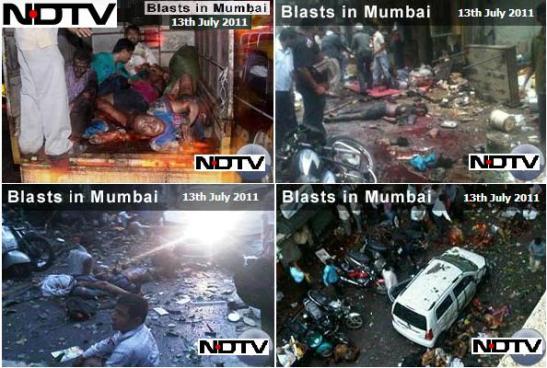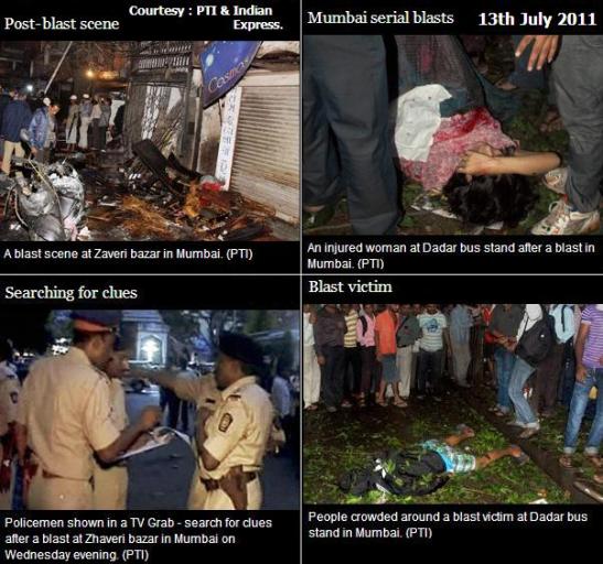 MUMBAI Jul 13, 2011 at 19-50 hrs IST : Islamists attacked Mumbai again to challenge Hindu majority in India. Most Hindus are victims uncared as usual. Three near-simultaneous explosions rocked Mumbai at rush-hour on Wednesday, killing at least 17 people in what the government said appeared to be another terrorist strike in the city hit by a major attack nearly three years ago as 26/11. Three blasts occurred in Zaveri Bazar, Dadar and Charni Road areas this evening, killing at least 17 and injuring more than 100 people.