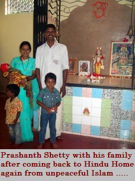 Udupi July 14-2011: For his love for a Muslim girl, he took no time to leave his mother religion. 5 years ago Prashanth Shetty married his lover Mushra. He got converted to Islam, appeared in a new name and new Muslim style. After 5 years he realised the situation, was frustrated to be a Muslim decided to return along with his wife and kids.
