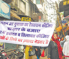 Jitters on the part of Police and Administration have been surfaced at the time to tackle a group of rowdy boys who deliberately objected and returned the Muslim girls and women who came for Eid marketing at ‘Bhopal Chowk Bazar’. Public stuck with the open banners depicting “aurotun ke liye ghaar jaida behattar hai” means “homes are the more suitable place for the women”.