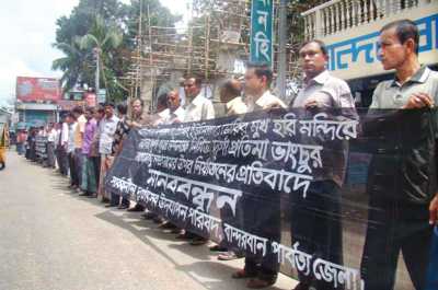 The members of the Hindu community in Bandarban town form a human chain on Monday protesting against the misdeed of some miscreants who damaged the clay image of goddess Durga in the district recently. BD Sun Photo