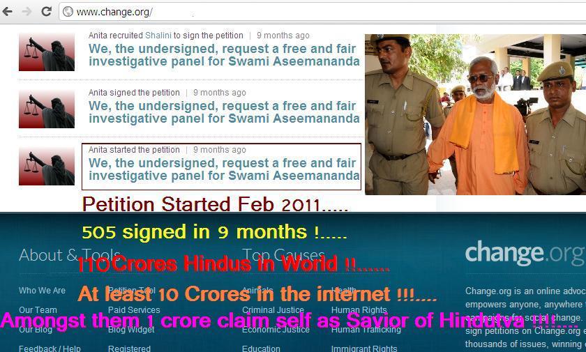 ***I hate those Hindus who see it but not signed…….. https://hinduexistence.wordpress.com/2011/10/18/silly-activism-in-sprouting-hindutva/ Please take this holy oath to free Swami Asheemananda Ji. Go to the link below. Sign the Petition and Campaign. http://www.change.org/petitions/free-hindu-saint-swami-asheemananda. After all she is our own sister, daughter of our home. Please don’t keep mum. http://www.change.org/petitions/save-the-hindu-woman-saint-sadhvi-prgya-thakur-from-the-indian-government THOSE WHO ONLY LIKE TO PLAY, RATHER DISLIKE MY ACTIVITIES…. OTHERWISE PLEASE GO TO THE LINKS ABOVE AND SIGN THE PETITION. PLEASE . PLEASE.