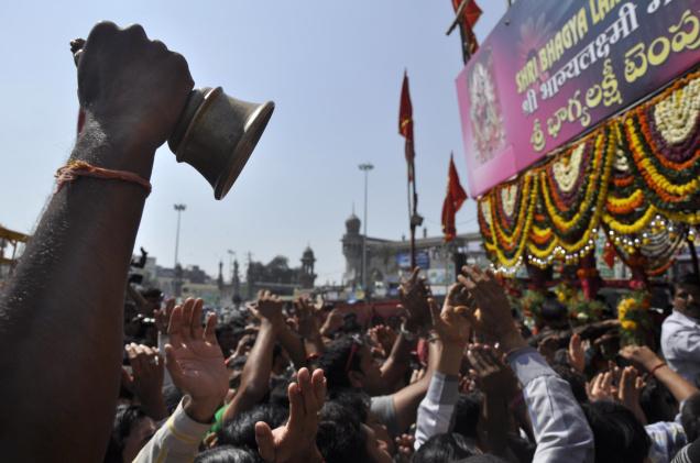 Devotees assemble at Bhagyalaxmi temple near Charminar on Friday. Photo: G.Ramakrishna