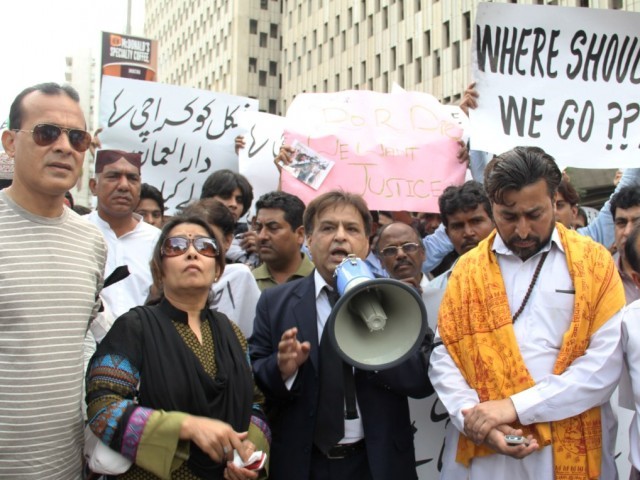 Ramesh Kumar, the father of a 28-year-old doctor, Lata Kumari, who was kidnapped last week from DHA’s Phase II, was at the protest. Lata was on her way to the College of Physicians and Surgeons of Pakistan.