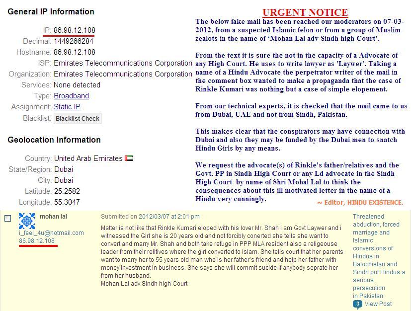 Learned connected Advocates of Hon’ble Sindh High Court, Pakistan, please do not ignore this mail/comment. Rinkle may be deported to UAE, consequently for flesh trade or making a woman suicide bomber. Ed. HINDU EXISTENCE.