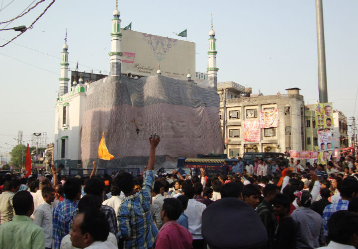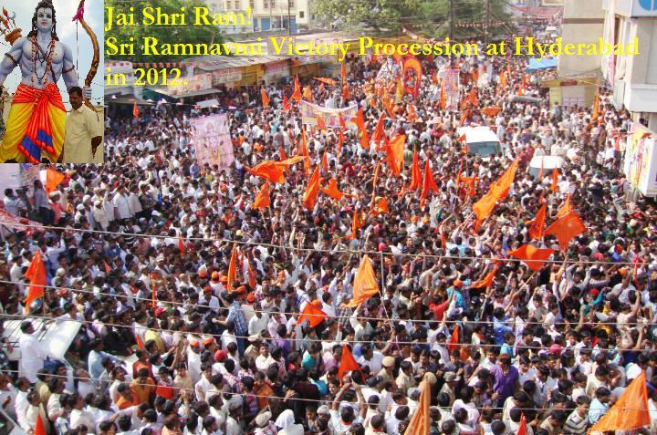 Ram devotees on. Islamists gone. Mosques kept covered, Muslim felons went underground in Hyderabad during huge Sri Ramnavmi Procession, 2012.