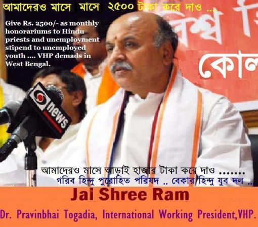April 20, 2012 | HE News Desk, Kolkata :: In a protest Meeting held at College Square in Kolkata on Friday, 20/04/2012 the Vishwa Hindu Parishad (VHP) said, it would launch a campaign in West Bengal demanding monthly honorariums to Hindu priests and unemployed youth to protest against the Mamata Banerjee-led government’s decision to pay honorariums of Rs.2,500 to imams.This site uses Akismet to reduce spam. Learn how your comment data is processed.