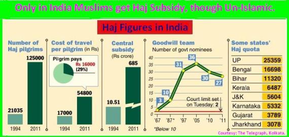 Every year, about 125,000 Indian Muslims (most of them are rich – Ed. HE) are subsidised to go on the Hajj.