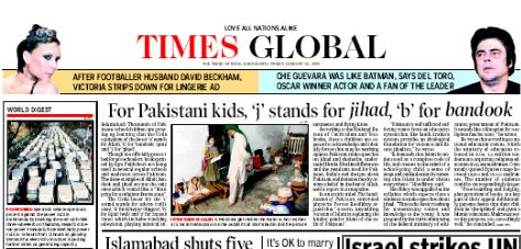 This type of heinous perversion to inject the violence and hate speech in the tender minds of the  early childhood came to surface on Times Global in January 2009. Despite many protests in different forums the Pakistan authority determined it safe and prosperous to breed Jihad bandwagon from the early days of Childhood.