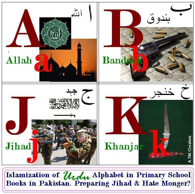 In Pakistan school books ‘A’ for ‘allah’, ‘B’ for ‘bandook’ , ‘J’ for ‘jihad’, ‘K’ for ‘khanjar’…..