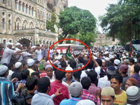 Hundreds of people poured in at Azad Maidan in south Mumbai this afternoon on a call given by a city-based outfit, Raza Academy, to denounce the riots in Assam and also alleged attacks on a minority community in Myanmar. [Some 10 Thousand Rohingya Muslims from Mayanmar are staying illegally in Delhi and other places in India. – ed.]