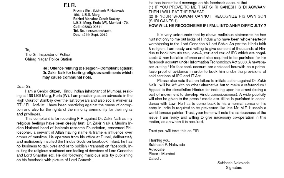 A complaint has been lodged by office bearers of Shiv Sena, BJP, Ganesha Festival Mandals and Hindu Janajagruti Samiti (HJS) with various Police Stations all over the State demanding that ‘when Ganesha Festival is being celebrated in peaceful atmosphere, Dr. Zakir Naik is trying to disturb Hindu-Muslim harmony by giving such challenge; therefore, case should be immediately filed against him’.