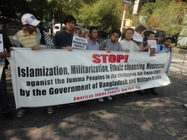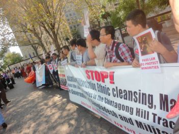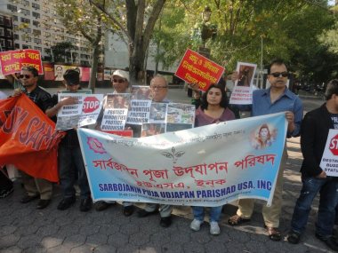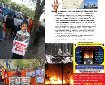 Base-reports and Pics received from Sitangshu Guha, NY, dated 06-10-2012 :: Nearly 20 different Hindu-Buddhist-Rights Groups in USA have registered their strong protest over Islamic atrocities upon the Bangladeshi Minorities in front of United Nations Head Quarter in New York on 5th Oct. 2012. The BHBCUC (Bangladesh Hindu Buddhist Christian Unity Council -USA), NABC (North American Buddhist Community), Bangladesh Hindu Mandir New York, Sarbojanin Puja Udjapon Parishad – INC., Bangladesh Puja Samity – NY, American Jumma Council -NY and other rights group vehemently condemned the recent Islamic plunder in Ramu, Patia and Ukhiya Buddhist monasteries, Hindu temples and over peace loving minority Hindu-Buddhist people in Cox’s Bazar and Chattagram areas in Bangladesh. In their long demonstration, the protesters all over USA gathered in the UN HQ to demand the safety and security of the minorities of Bangladesh now under a severe persecution of various Islamist factions as if getting a permission of the reluctant Bangladesh authorities.