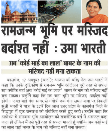 He said: “Regarding the Sri Rama Janma Bhumi it is the view of all the Sants of the country that on the acquired 70-acre land only a huge temple to Sri Ram Lala would be built and the construction of no new mosque would take place within the scriptural and cultural rim and perimeter of Ayodhya. From the labors being put in by the Hon’ble Judge it seems that Sri Mulayam Singh Yadav wants to build a mosque and an Islamic Cultural Centre on the said plot of land (where an Ara/saw machine stands) adjoining the 70-acre acquired land of the Central Government. The Islamic forces are compelling him to do so.”