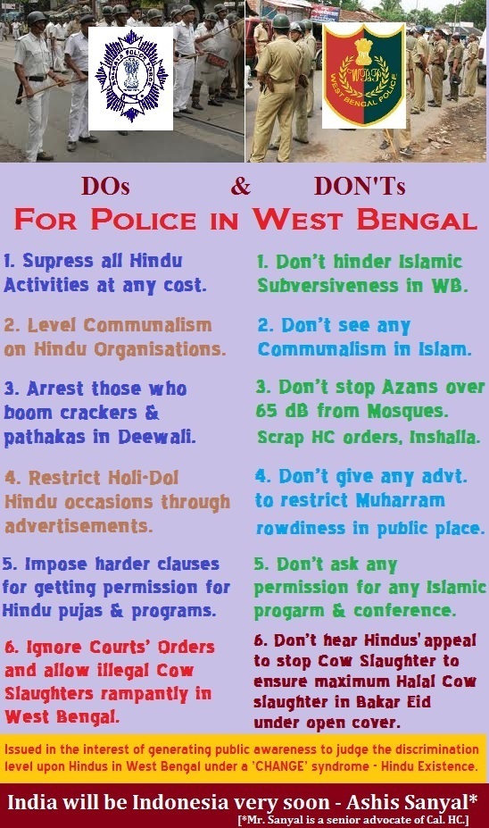 We request the Honorable Government of West Bengal to investigate this issue thoroughly and take stringent action against such errant public servants, who break the very law they are supposed to enforce.We also urge the West Bengal Administration to stop the official repression of the state’s ancient and vibrant Durga Puja by revoking the ban on the Divine Mother’s immersion on October 26 and 27, 2012.We would like to respectfully remind the administration that banning the centuries’ old indigenous Bengali tradition of Durga Puja immersion (in order to appease a violent, alien, Arabic creed of Bakr Id) is tantamount to turning Bengal (or what is left of it) into another East Pakistan.The apathy and indifference of the officials makes us wonder if West Bengal is a part of India (where Indian law is upheld) or a part of East Pakistan (where Shariah is upheld).We sincerely hope that you will act immediately in upholding the judgements of the Hon. Supreme Court and Kolkata High Court and especially in the interests of keeping West Bengal within India, and not letting our motherland become another East Pakistan.