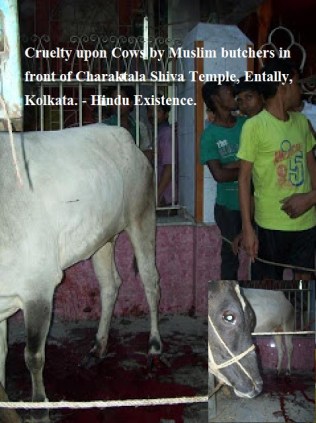It should be mentioned here that Hindus of this area protested cruelty upon animal on Saptami day (2nd day of Durga Puja) while some Muslim butchers ghastly pulled on a cow, which succumbed a severe fracture and bleeding from its leg. The fatigued cows took refuge in front of Charaktala Shiva Temple (near 2 no. bridge, Park Circus) incidentally and the blood splashed out to the inside of that temple, for which the Hindus reacted severely all on a sudden.
