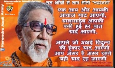 Shree Bala Thakrey was one of the greatest Hindu nationalist in India. We, Nepalese people also always regard his aspirations and contribution.. Actually, he is just like great memorial Hindu leader in all over the world. He never compromised on any Hindu issue for the power or any allurement. His vision for Hinduism in immortal. He stood with all of us who chose the difficult path of the similar vision in the atmosphere polluted by power mongers & vote greedy Muslim appeasement. In the issue of Muslim reservation or of Bharat-Pak Cricket he had his clear & strong views which gained him criticism from the so called seculars but he kept on walking on his chosen path like a True Tiger! He would always take trouble to call many of us when we would raise any Hindu issue. In the time of Ram Mandir in Ayodhya was great.