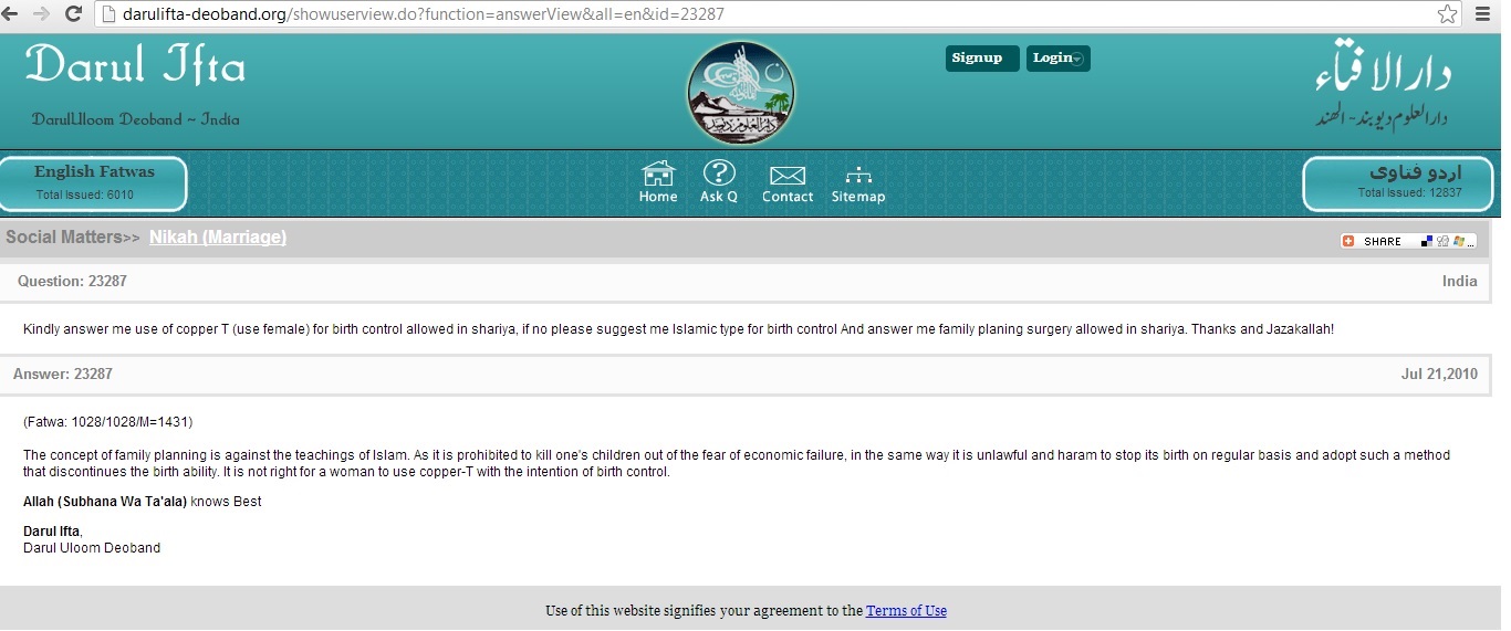 The Islamic seminary of Deoband is giving fatwa whenever necessary for rejecting Birth Control as it contradicts the planning of Allah to capture this world by Muslim populace. It can clearly be seen in a fatwa no. 23287 dated Jul 21,2010 (screen shot pic. is published here), where it is said that “The concept of family planning is against the teachings of Islam. As it is prohibited to kill one’s children out of the fear of economic failure, in the same way it is unlawful and haram to stop its birth on regular basis and adopt such a method that discontinues the birth ability. It is not right for a woman to use copper-T with the intention of birth control”.
