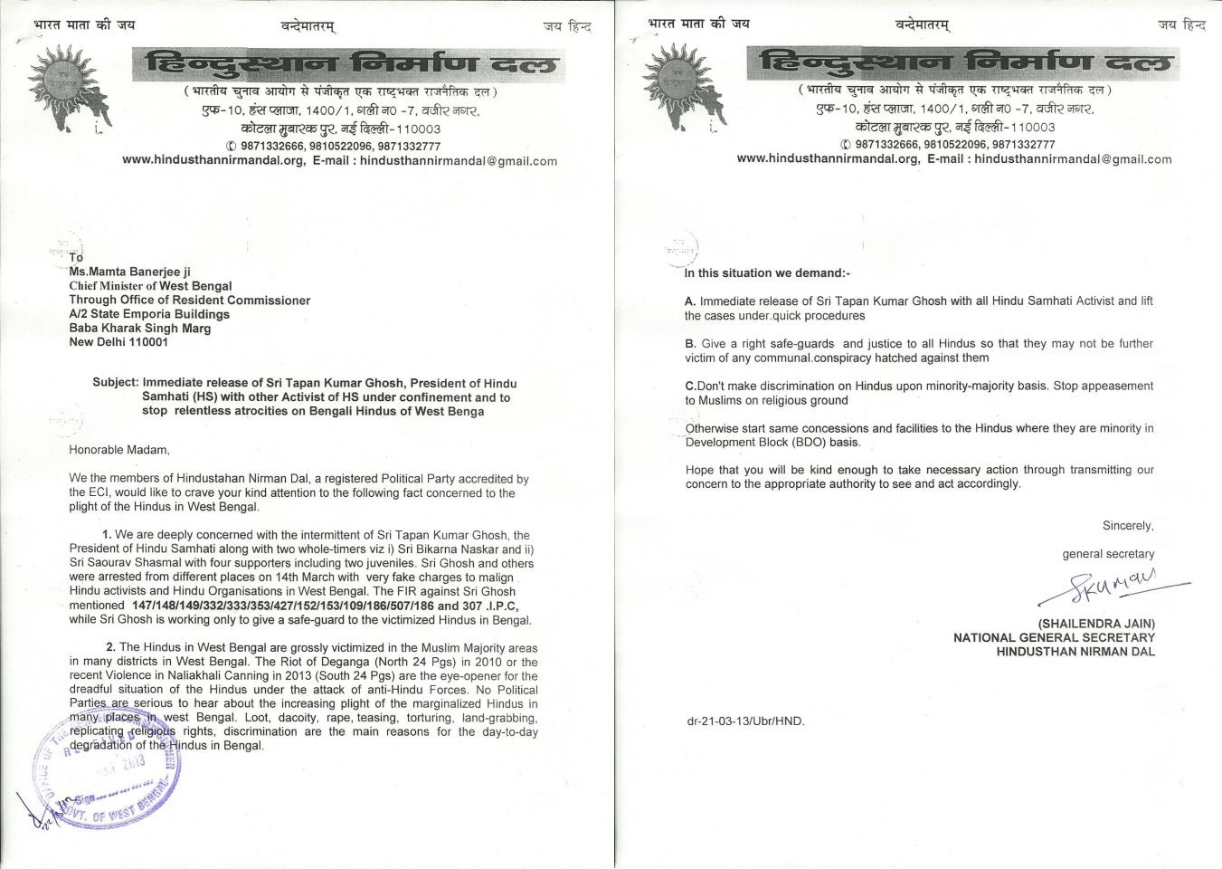 In the memorandum it is pressed that “We the members of Hindustahan Nirman Dal, a registered Political Party accredited by the ECI, would like to crave your kind attention to the following fact concerned to the plight of the Hindus in West Bengal.