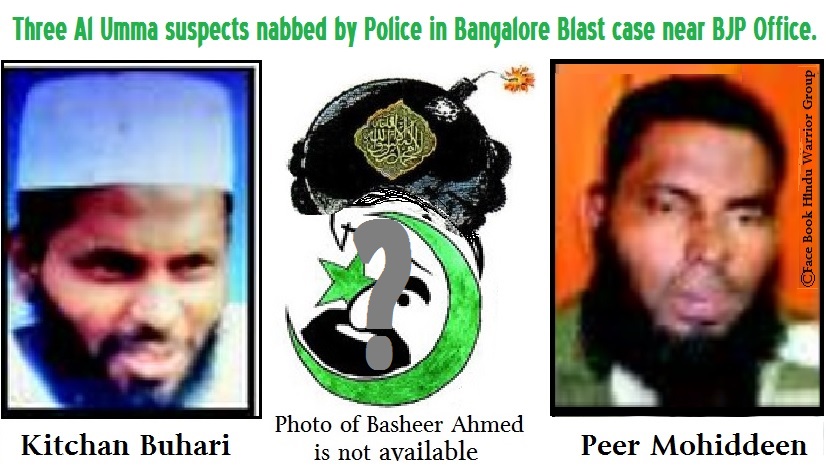 Al Umma Suspects nabbed for Bangalore BlastArun Dev & A Selvaraj | TNN  | Bangalore- Chennai | 24 April 2013:: Three suspects arrested in connection with last Wednesday’s bomb blast near the BJP headquarters in Malleswaram, were brought to Bangalore on Tuesday morning. K Peer Mohiddeen, 39, and J Basheer Ahmed, 30, were nabbed at a Chennai lodge on Monday night, while Kitchan Buhari, 38, was picked up at the Mattuthavani bus stand in Madurai around 8.30 am Tuesday.