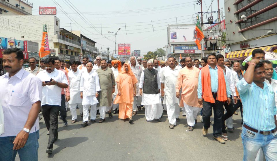 A large number of people, including those riding on motorcycles, took part in it, shouting slogans against terrorism and the policies of state government. Activists of BJP, Vyapar Sangathan, VHP, Gorakhnath Poorvanchal Vikas Manch and others took part in the procession.