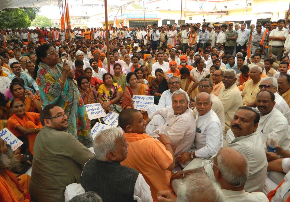 State BJP president Laxmikant Bajpai, BJP MP Aditya Nath and several other leader took part in the sit-in.