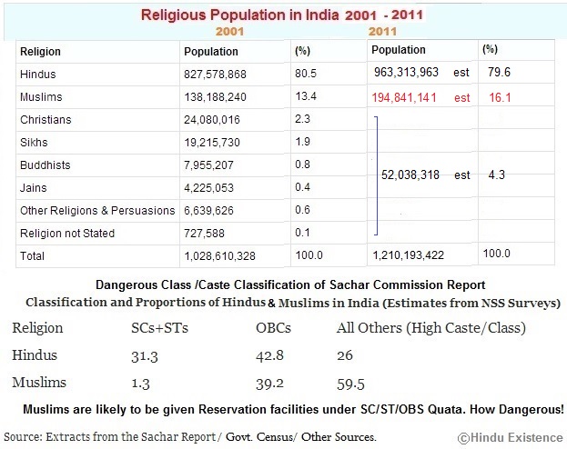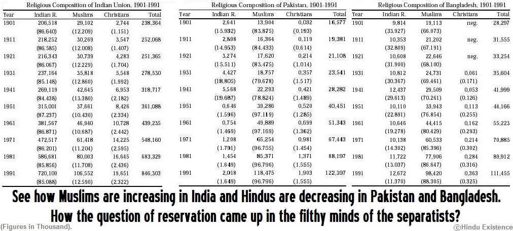 3.  Hindus in Pakistan are almost finished. (Hindus reduced from 16% to less than 2%). The eastern part of Pakistan, i.e. Bangladesh is now under a fanatic Islamization and Hindus have been reduced to 8% from a high of 23%. On the other hand, Muslim population  in India has been boomed from a leas than 4 crores in 1947  to a high of 20 crores in 2013 (including illegal infiltrator Muslims from Bangladesh, Pakistan, Myanmar, Afghanistan etc.). Compilation of reports from Govt. census and other reports show that there are 19,48,41,141 Muslims in India in 2011. Muslims in India are well protected and they are flourishing in every fields. All the prime posts are/were adorned by Muslims. As per Govt. statistics, no Muslim has been died in starvation so far, but all the people died under starvation are Hindus, tribes or non-Muslims. Muslims are well protected under laws of the land, then why a hue and cry for such a Muslim reservation?