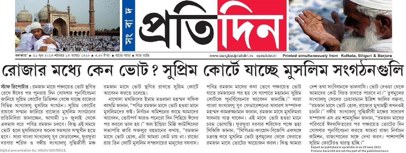 News Flash: 2nd July 2013: New Delhi:: Describing The Holy Constitution is above all, the Hon’ble Division Bench of Mr A. K. Patnaik  and Mr. Ranjan Gogoi (JJ.) delivered that it’s decisions made on 28th June is final and the scheduled poll terms for West Bengal Panchayet Election will be held in five phases in the Ramzan timings without putting any impediment. In this significant verdict of the Hon’ble Supreme Court of India made it clear that the appeasement mentality or the undue pressure groups of fanatics are not important in the eyes of Judiciary, so far. Now, the joint operators of WB State Govt, Ruling TMC Party, Congress and the Fundamental Political Jihadi Groups must learn the limit to foil the Ultimate Judiciary in the name of minority appeasement and  Muslim Vote Bank. Hindu Existence Forum conveys its high regards to the decisions so far made by the Hon’ble apex court o India.  Jai Hind.