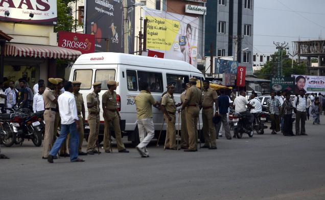 Police pickets deployed on the service lane of the Chennai-Bangalore NH – 4 near the new bus stand in Vellore following an agitation sparked by the murder of Hindu leader. Photo: C. Venkatachalapathy, The Hindu.