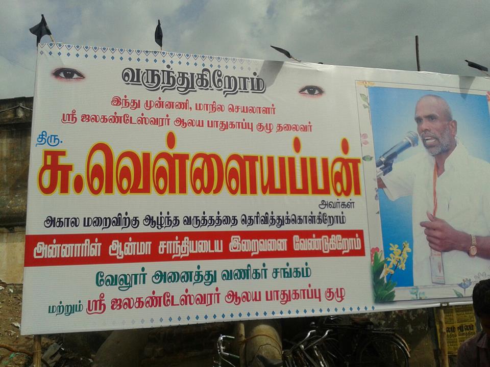 Vellore | Hindu Existence News Bureau | 2 July 2013:: Hindu organizations in Kerala and Tamil Nadu observed Tuesday as ‘protest day’, following the brutal murder of S Vellaiyappan (45), state secretary of Tamil Nadu Hindu Munnani. Hindu Aikya Vedi also staged a demonstration in the evening protesting against the gruesome murder in various places in Tamil Nadu and Kerala.