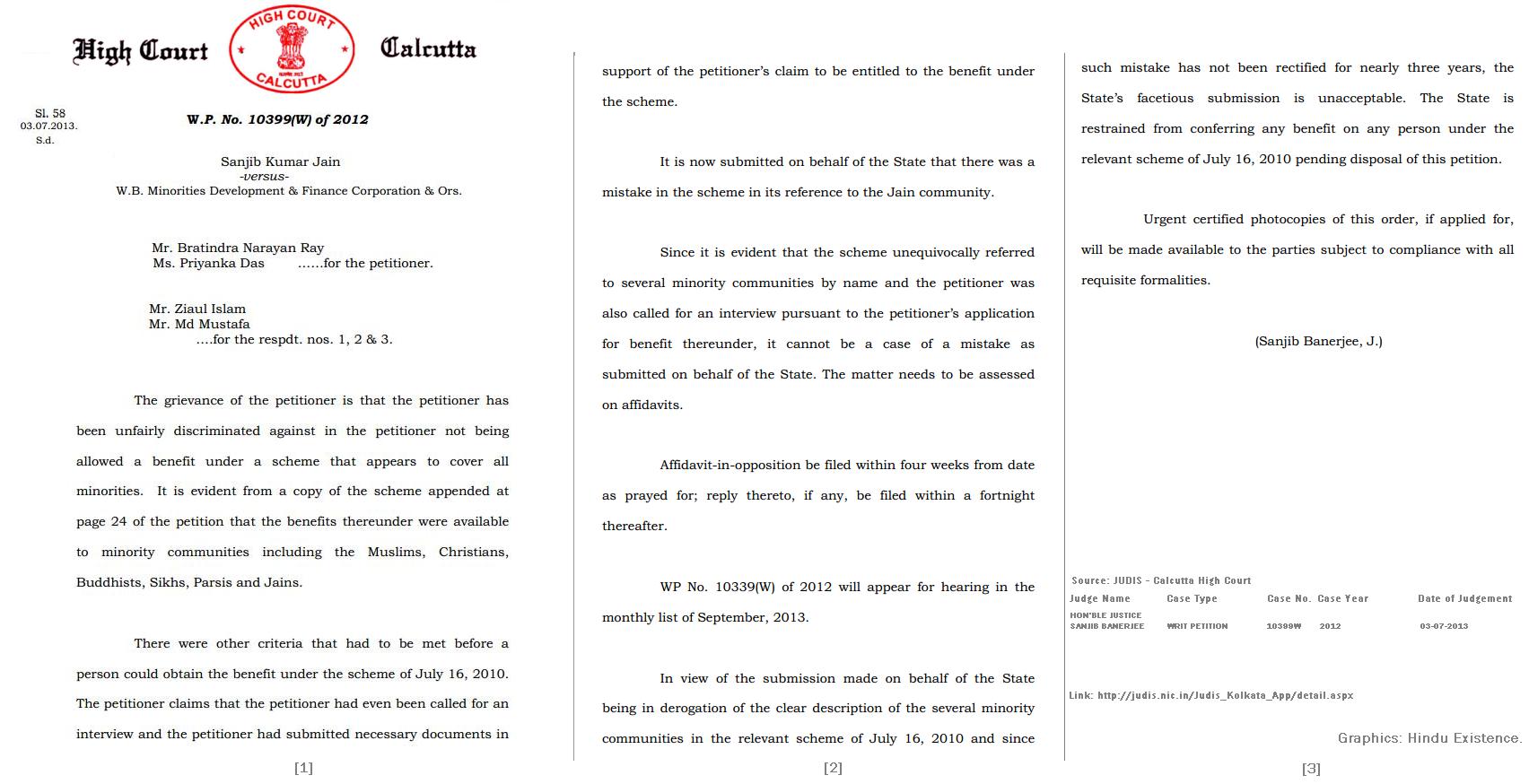 In his landmark order on 3rd July 203, Justice Sanjib Banerjee asked the State respondents to file affidavit to clear their stand to exclude Jain communities from the state notification upon which the advertisement was published to give term loans to all six minority communities of West Bengal as Muslim, Christian, Buddhist, Sikh, Parsee and Jain.