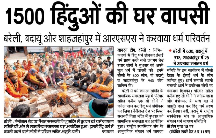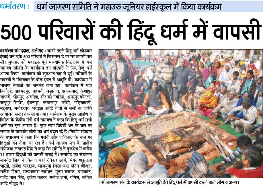 The highest re-conversion (Suddhi) in Aligarh, where 2000 Christian became Hindus, was held by Dhrama Jagran Samiti, a specific unit of VHP to make special efforts to sensitize the sense of Dharma in the marginal Hindus in any vulnerable condition, likely to be grabbed by the evangelic elements or other vicious elements like Zakir Naik .