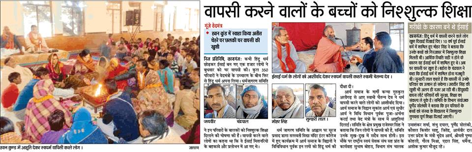 OmMayor of Agra Town, Sri Indrajit Arya was also present in the program . In the ceremony held at Saraswati Vidya Mandir at Kasganj, 350 families ( about 1,000 people) and Firojabad 66 families (200 people) rejected Christianity and returned to their traditional faith Hinduism once again .