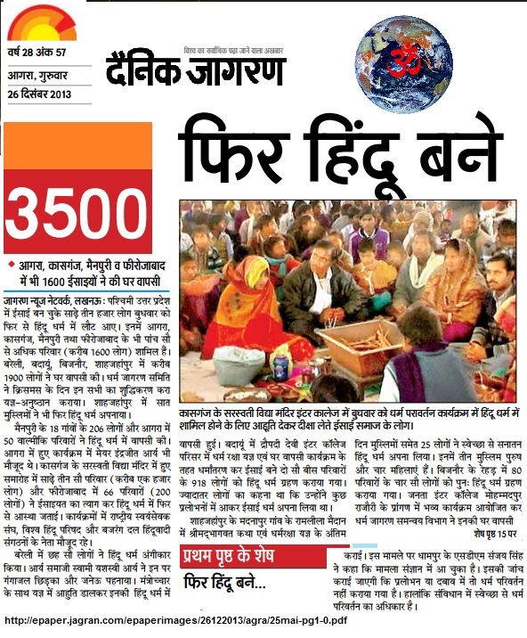 On the very 25th Dec this year 2013, more than five thousand people returned to Hinduism and said  goodbye  to Christianity in a vast area of  Uttar Pradesh  in the localities of Agra, Aligarh, Kasganj, Bareilly, Badaun, Bijnor, Shahjahanpur, Mainpuri  and Firojabad.
