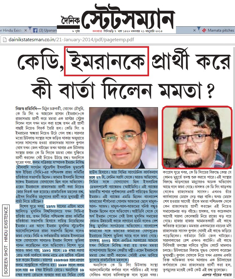 This man Imran has an outstanding Islamic record to contribute enough to establish a land of Islam in India staring from West Bengal and Assam. And for this exemplary contribution, the most adorned Islamic Icon of Bengal Mamata Banrjee (most of people call her Mamtaz Banu Arjee), nominated such a hard-core SIMI and Islamic activists for a Rajya Sabha Seat so that the Islamic voice may rant the well of Indian Parliament. Vote bank politics and Muslim appeasement of Mamataz Banu drags West Bengal once again at the verge of communal separation due to the divisive approach of the State authority and CM’s will under the exclusive control of Furfura Shariff House, Tipu Sultan Mosque or Kalom News Bureau.