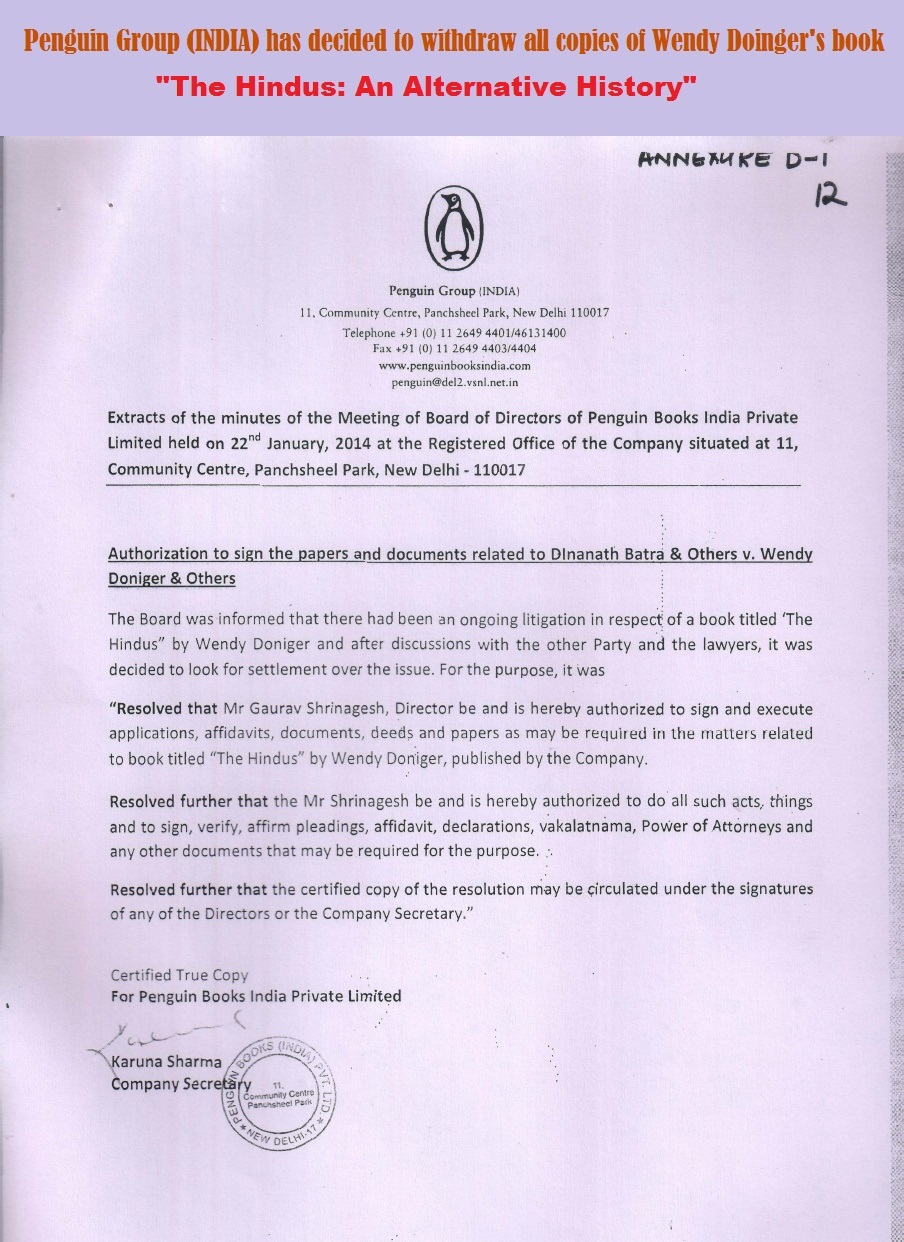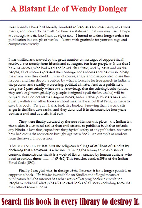 While accepting the settlement, Penguin said it “respects all religions worldwide”.Ms Doniger however defended the publishing house, saying, “Penguin, India, took this book on knowing that it would stir anger in the Hindutva ranks, and they defended it in the courts for four years, both as a civil and as a criminal suit.” ……. The Shiksha Bachao Andolan moved court in 2011 arguing that Ms Doniger’s book insults Indians, especially Hindus, and is full of factual errors.The fringe group slammed the book as a “shallow, distorted, non-serious presentation of Hinduism filled with heresies and charged that the author’s approach was “that of a woman hungry for sex.”In an earlier interview, Ms Doniger had said, “I have a double disadvantage among the Hindutva (pro-Hindu) types. I’m not a Hindu and I am not a male…it’s considered unseemly for a woman to talk about sex.”The 800-page book, which was priced at over Rs. 700, is already out of stock in popular online shops but downloadable copies are being circulated on Twitter.