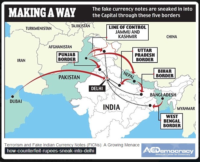Animesh Roul | American Center For Democracy Blog | 22 Feb 2014:: The fake currency trade has been haunting Indian security establishments as well as economic intelligence agencies for quite a long time. Most recently in February 2014, the finance minster of India informed the Upper House of Parliament (Rajya Sabha) that counterfeit Indian currency notes worth INR 107.33 crores (approximately US $ 17 million) have been seized between January 2010 and June 2013. If the intelligence agencies are to be believed, the FICNs are printed in Pakistan and brought to India through couriers via Bangkok, Kathmandu and Dhaka airports. There are also reports that the FICN cartels are pushing counterfeits through China, Malaysia, the United Arab Emirates (UAE), Denmark, Netherlands, Singapore and Sri Lanka.